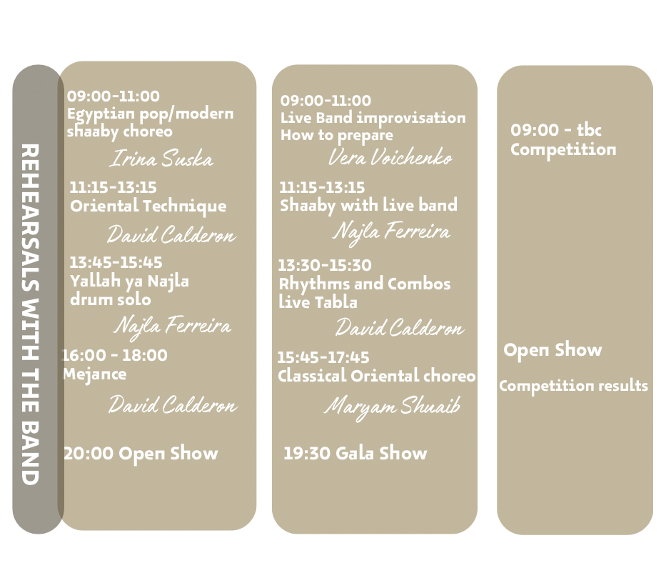 ◆Semi-prodancers are individuals, who have gained some experience in oriental dance, but do not make a living from teaching or performing it professionally. They also did not win first place in the semi-pro category at the previous edition of our Festival.